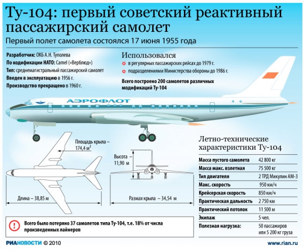 1. Ту-104 стал первым советским реактивным пассажирским воздушным судном. В 1955–1960 годах он выпускался в различных модификациях (на 50–100 пассажиров) на авиазаводах в Харькове, Омске и Казани. Всего был построен 201 экземпляр. В гражданской авиации самолет использовался до 1979 года, в военной – до 1981-го.